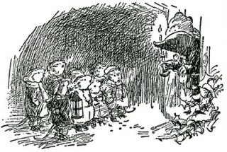 “It was a pretty sight, and a seasonable one, that met their eyes when they flung the door open. In the fore-court, lit by the dim rays of a horn lantern, some eight or ten little fieldmice stood in a semicircle, red worsted comforters round their throats, their fore-paws thrust deep into their pockets, their feet jigging for warmth. With bright beady eyes they glanced shyly at each other, sniggering a little, sniffing and applying coat-sleeves a good deal. As the door opened, one of the elder ones that carried the lantern was just saying, ‘Now then, one, two, three!’ and forthwith their shrill little voices uprose on the air, singing one of the old-time carols that their forefathers composed in fields that were fallow and held by frost, or when snow-bound in chimney corners, and handed down to be sung in the miry street to lamp-lit windows at Yule-time.”
