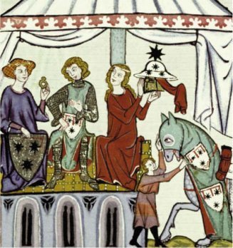 | This illustration, taken from a Medieval manuscript, is on the front cover of an old Penguin edition of Sir Gawayne and the Green Knight. |