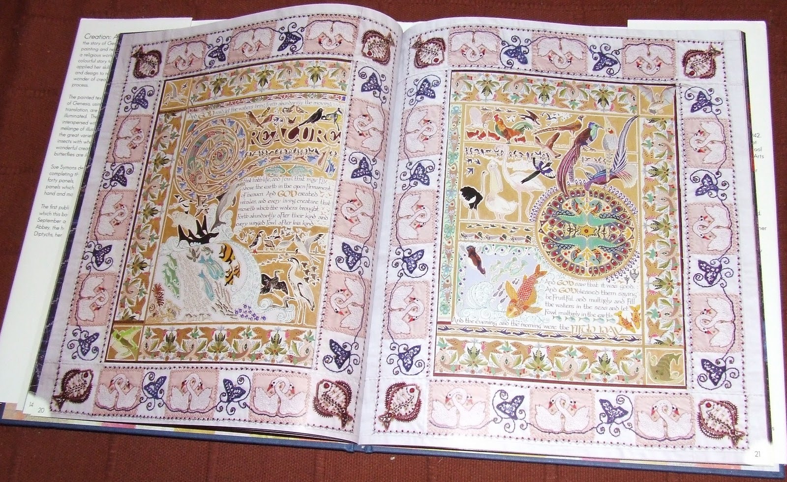 I had other commitments on Tuesday, and couldn’t do my volunteering shift at the Oxfam bookshop, so I popped in today, spent the morning tidying shelves in the storage area, treated myself to curranty, sugary Derby biscuits from the baker’s next door – and bought this beautiful book, Creation: A Celebration, by Sue Symons, who uses painting, calligraphy and embroidery to depict the story of Genesis.