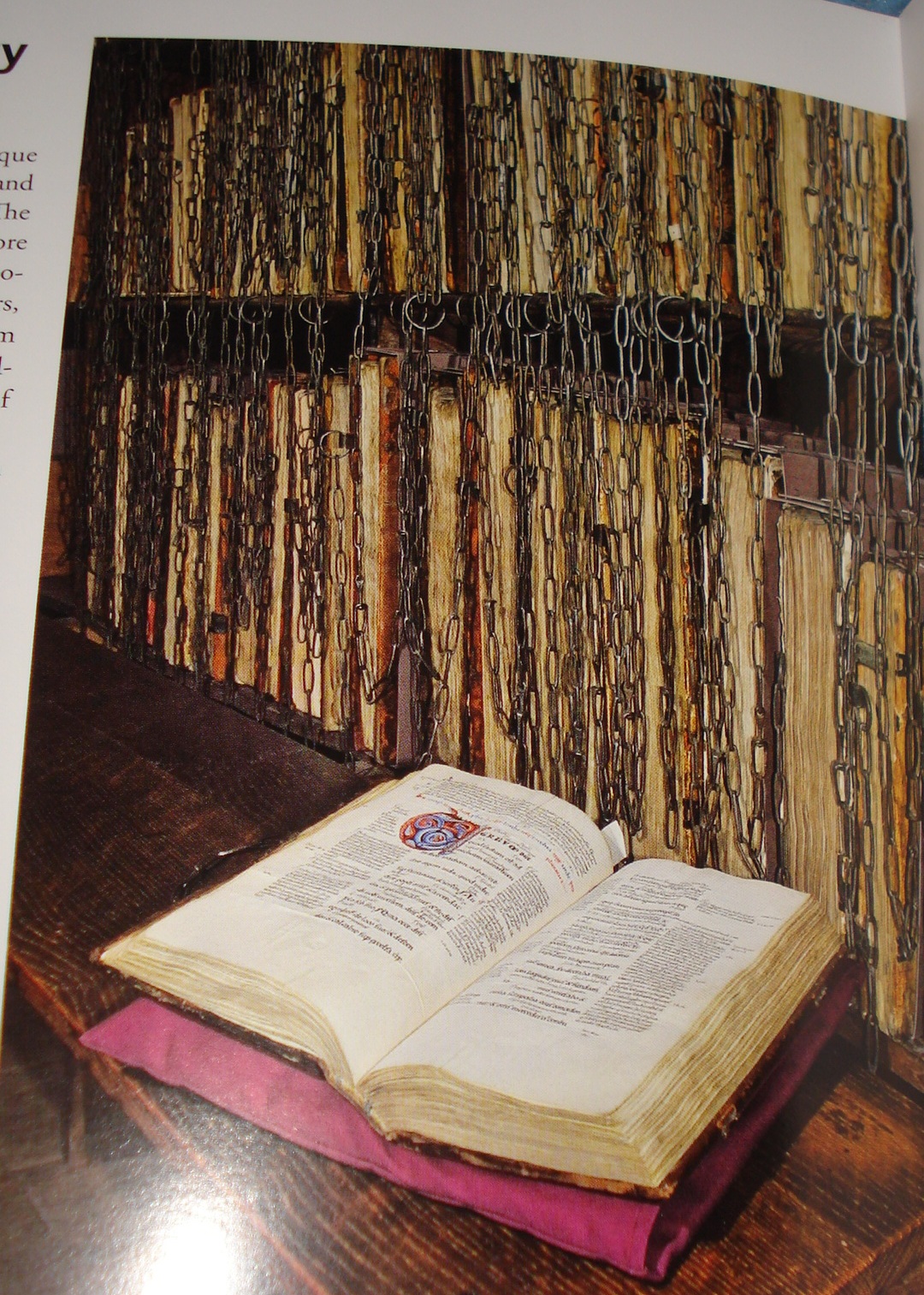 The first thing you notice is that the books are stored upright, the wrong way round compared to modern custom – the spines are at the back of the shelves, where they cannot be seen, and it is the page edges which face you. Each book has a metal chain, attached to the front edge of the cover with a hasp, with a ring at the other end slotted over a metal rod which runs the width of the cabinet. The books can be lifted down and read, but the chain cannot be removed unless everything is unlocked.