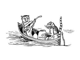 Anyway, I am sure you are all aware of Lear’s limericks (he wrote more than 200 of them) and his nonsense verse, including The Owl and the Pussy-cat, which most people seem to think is a nursery rhyme, which is a shame, because he deserves some recognition for what must be one of the most joyful – and silliest – poems in the English language. The whole idea is just so delightful: an owl and a cat sailing away to get married – but I’d love to know why they took honey with them, and why was the money wrapped up in a £5 note. Does the £5 note not count as money?