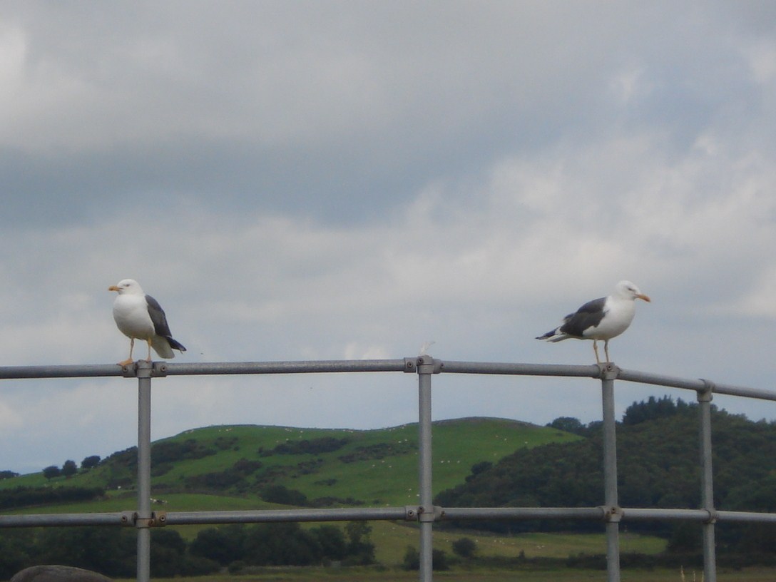 Seagulls, not flying (my camera is not good enough to snap them aloft) but perched on a jetty railing. |