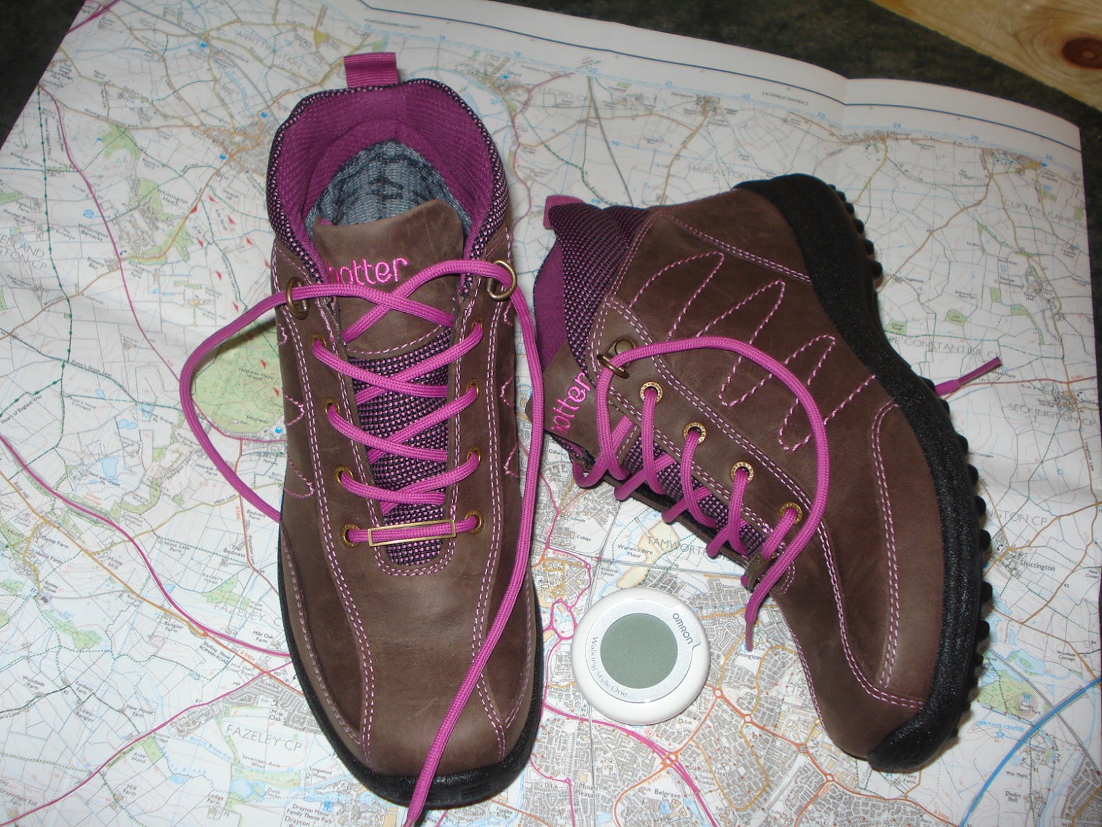 I have walking boots! Proper walking boots! With pink laces! The Man of the House is very dismissive about those laces – I think he feels pink is far too frivolous for sensible footwear for a woman who wants to be taken seriously. But I don’t care. They are so beautiful and so comfortable that I love them to bits. I tell you people, until you have worn shoes designed to for walking, you have no idea how uncomfortable fashion flatties and spindly heels actually are. So here the boots are,  for my Saturday Snapshotwith a map, and the new pedometer.