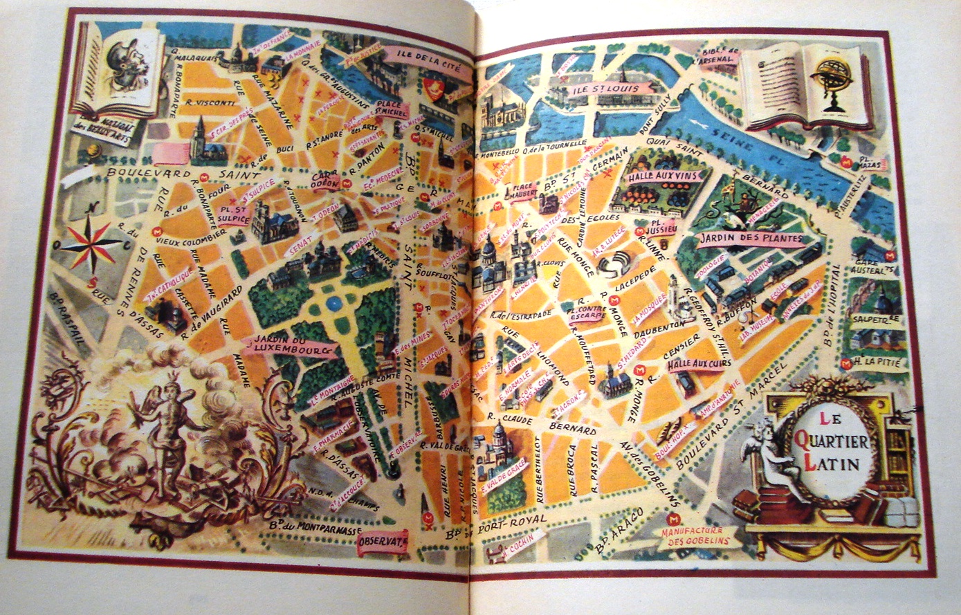 Anyway, I thought I’d tell you about The Paris We Love, which belonged to Mum, but when she moved she didn’t have room for all her books so she gave this to me, and I was really pleased, because I’ve always loved it.  Published by the McGraw-Hill Publishing Company Ltd in 1950 (it’s older than I am), it is jam-packed with fascinating details, and crammed with maps and illustrations – most of them in colour. It must have been quite something when it was new, because paper rationing only ended in 1949, the year before this was published, and there had been stringent guidelines about the way books were printed, with recommendations about print size, margins and blank space. Pictures, which took up precious room, all but disappeared.