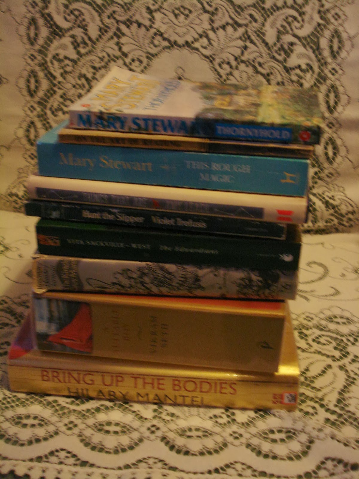 And there’s the Arthur Quiller-Couch’s essays On Reading, kindly sent by Pam at Travellin’ Penguin, and for light relief I’ve got two Mary Stewart novels on the TBR pile, Thornyhold, and This Rough Magic.