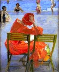 I love the bright, joyous colour of that dress, and the matching hat – you’d have to be very happy, and very sure about yourself to wear it I think, otherwise the outfit would wear you, and you’d be lost. She’s enjoying the short time she’s snatched for herself, sitting reading while her children are swimming (unless they’re nieces and nephews, or younger brothers and sisters). And although she seems lost in her book, part of her is still listening out for the children, to make sure they’re OK. It’s exactly what I used to do when I took the DDs to the swimming pool, the local theme park, or other unavoidable sporting activities!