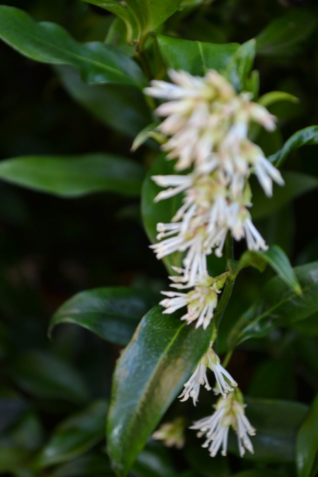 Or this little creamy white bloom that I think is sweet box – to start with, because of the perfume, I thought it might be some strange kind of jasmine, even though the flower is not right for that. But, like jasmine, it seems to perfume the air for a good distance around: