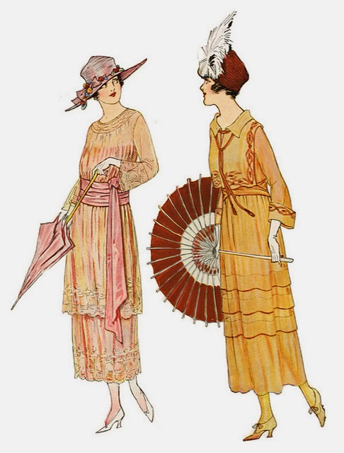 I imagine Patricia’s dress looking a little like the pink one on the left, but in black, with some white trimming, and red flowers at the waist. From Delineator May 1918 |