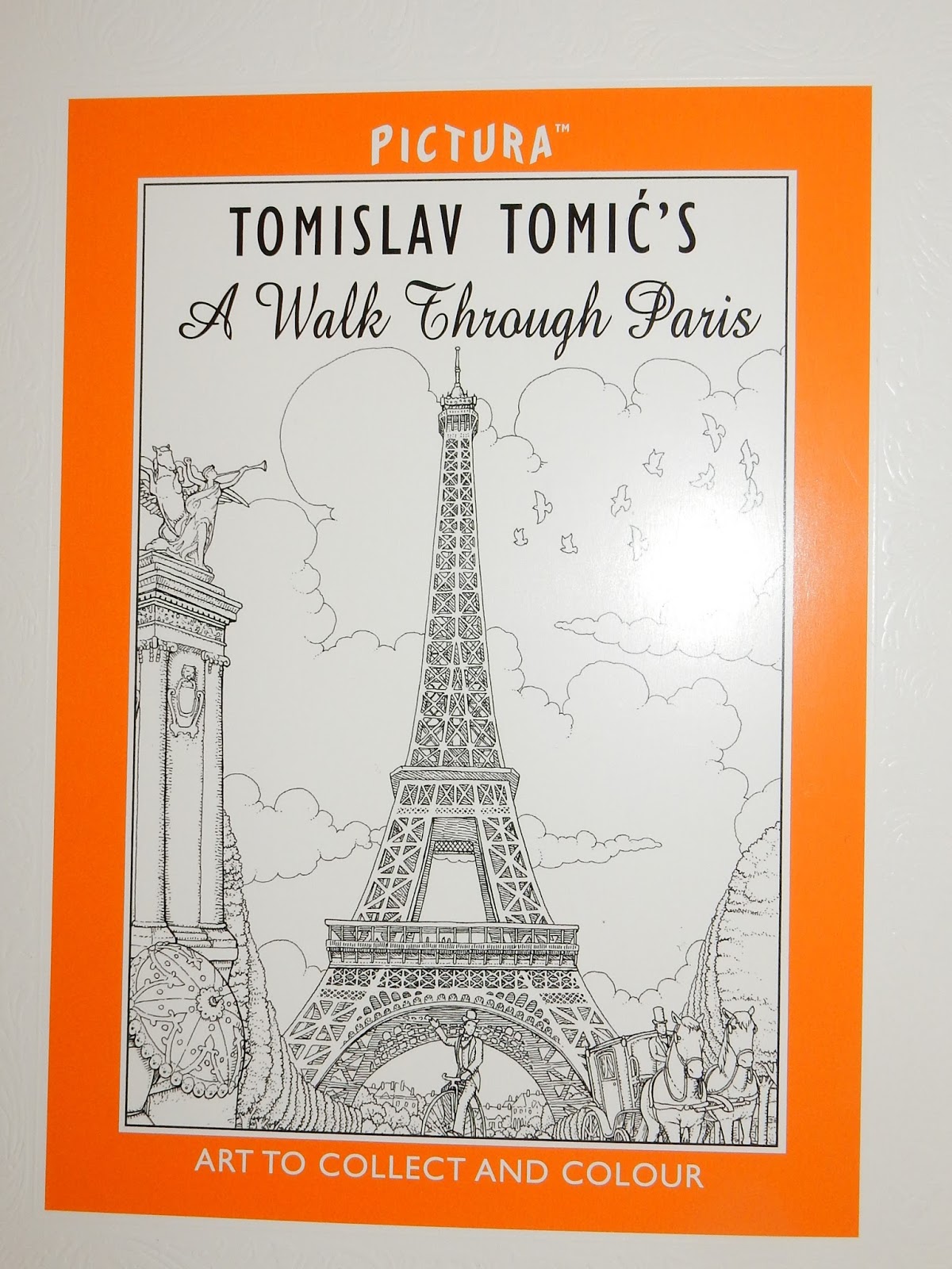 OK people, I’m still in French mode for Paris in July, so let’s start with a photo of the Eiffel Tower I took when I was last there. I look at this and it conjures up happy memories of some wonderful holidays in Paris. Anyway, enough of the past, now it’s time for a little frivolity, in the shape of a wonderful colouring book: Tomislav Tomic’s A Walk Through Paris. It’s got a picture of the Eiffel Tower on the front, and the inside is like a concertina, with eight panels opening out into a long panorama of the city’s iconic landmarks, and  ladies and gentlemen in Victorian costume strolling along the boulevards. When you look closely there are all kinds of things going on, like a daring young man looping the loop in his flying machine, a balloonist up above the city,  a man rowing on the Seine, and another on a penny farthing. On the other side of the picture are individual vignettes of the buildings, with brief details about their history, and there’s even a space for you to produce your own artwork.
