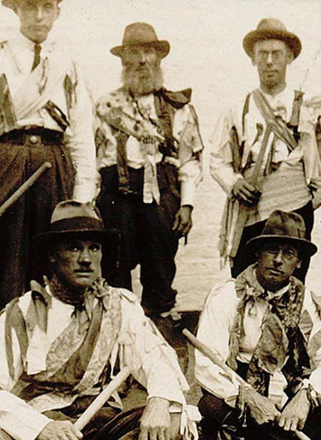 Black and white photo of Morris dancers from English Folk Dance Society (borrowed from https://clothesinbooks.blogspot.com/).